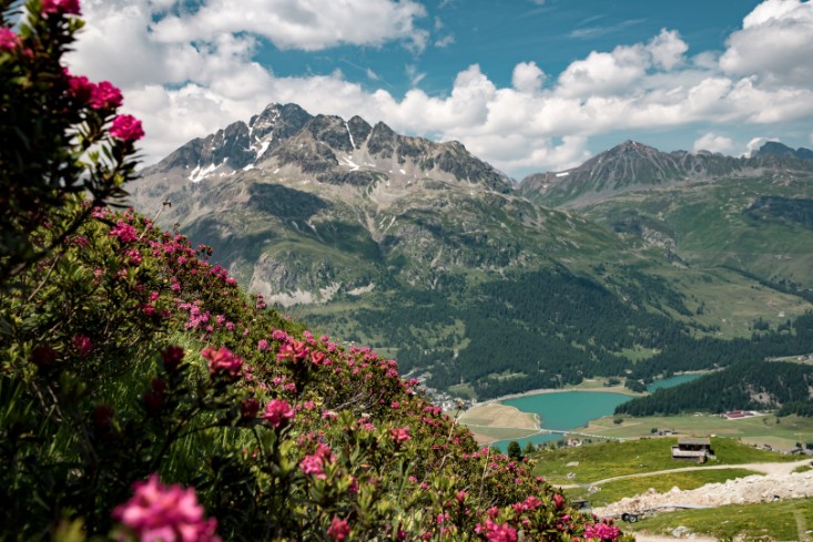 Piz Corvatsch (3.451m) in das Ober Engadiner Tal. Unten im Tal ist der